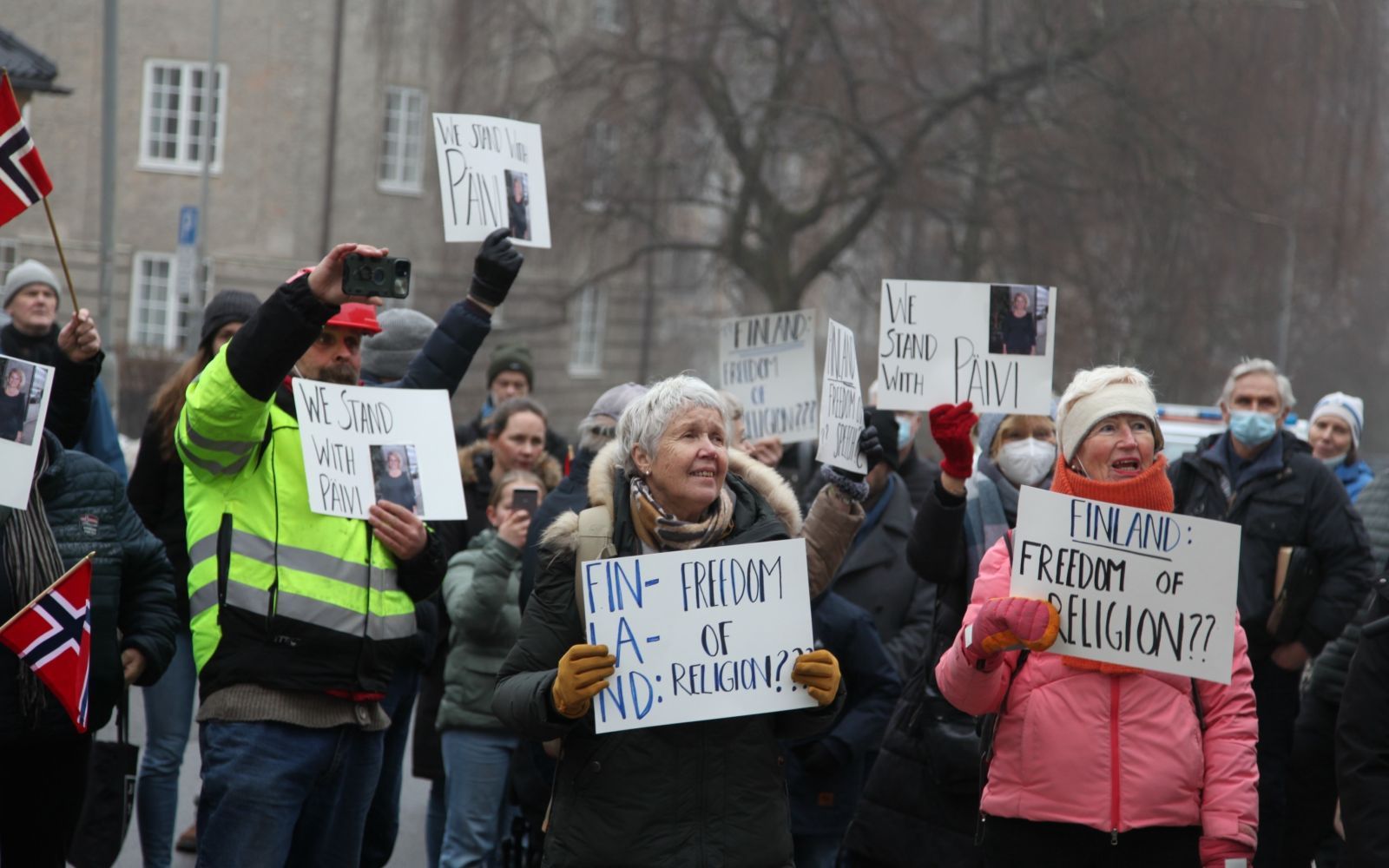 Om lag 120 mennesker stilte opp utanfor den finske ambasaden for å markere støtte til Päivi Räsänen. Ho er en finsk politikar som stend for retten fordi ho har sitert Paulus i samlivsspørsmål.